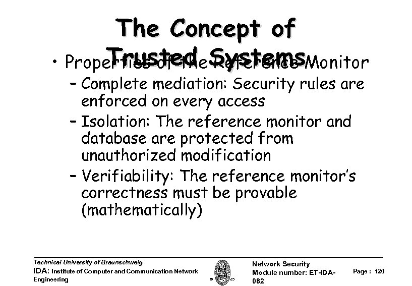 The Concept of Trusted Reference • Properties of the. Systems. Monitor – Complete mediation: Security rules are enforced on every access – Isolation: The reference monitor and database are protected from unauthorized modification – Verifiability: The reference monitor’s correctness must be provable (mathematically) Technical University of Braunschweig IDA: Institute of Computer and Communication Network Engineering W. Adi 2005 Network Security Module number: ET-IDA 082 Page : 120