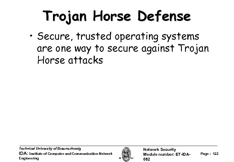 Trojan Horse Defense • Secure, trusted operating systems are one way to secure against Trojan Horse attacks Technical University of Braunschweig IDA: Institute of Computer and Communication Network Engineering W. Adi 2005 Network Security Module number: ET-IDA 082 Page : 122
