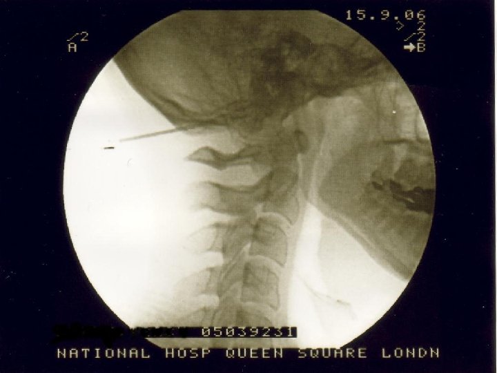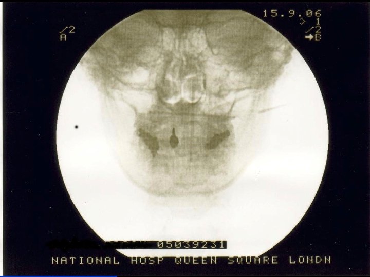 Skin marking n n n Awake, sitting upright on stool Midline Intermastoid line Spinous process of C 1 3 cm from midline Chosen position of battery