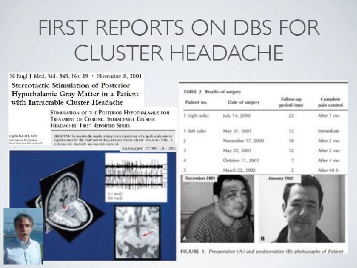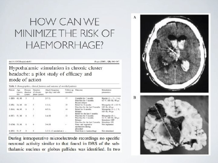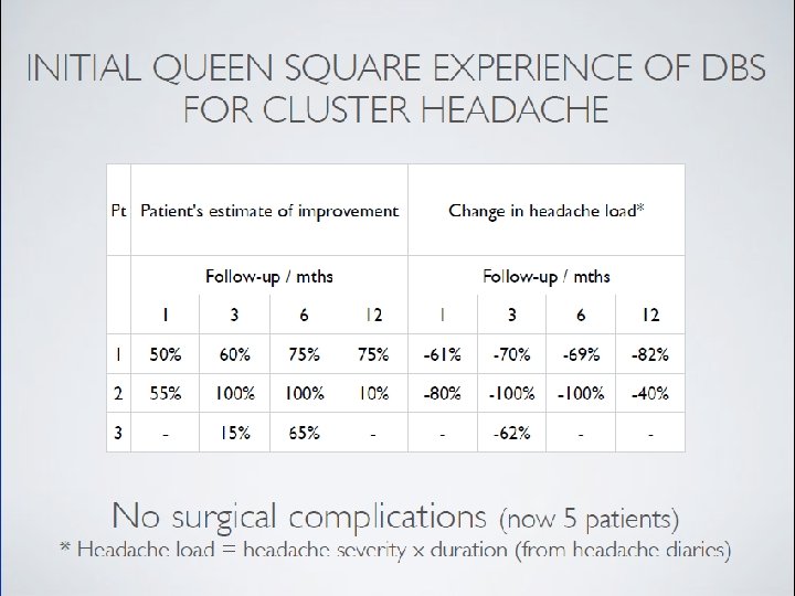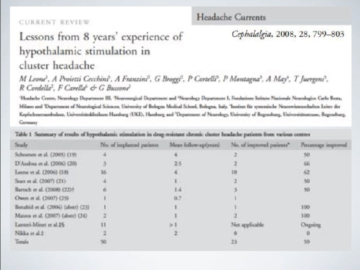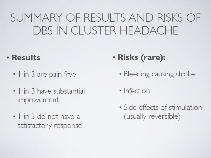 Conclusions n n Consider in patients with chronic, disabling, intractable primary headache ONS and DBS are both “low risk” when practiced in a multidisciplinary team and in experienced hands (but the rare complications in DBS can be severe)