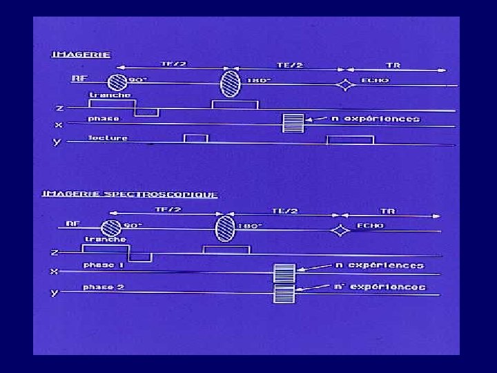 SRM multivoxel: IMAGERIE MÉTABOLIQUE Méthode de localisation L’acquisition simultanée d’une matrice spatiale 1 D, 2 D ou 3 D de spectres est réalisée après excitation et codage de phase. carte de spectres