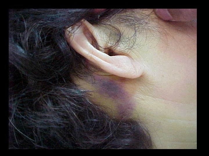 Skull Fracture • Basilar skull fracture: – Most often involving the temporal bone – Clinical diagnosis (CT often fails to show fracture) • Raccoon’s (Panda’s) eyes, hemotympanum, Battle’s sign (mastoid ecchymosis), CSF rhinorrhea • Depressed skull fracture: – Surgical elevation: • if greater than width of skull or • > 5 mm