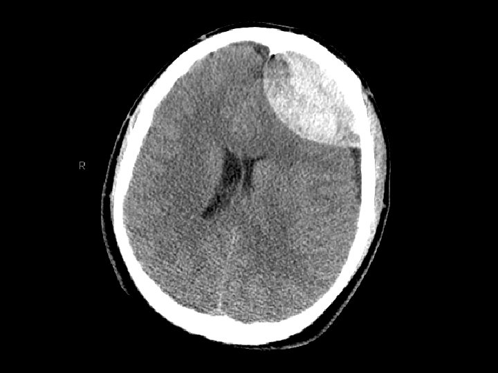 Epidural Hematoma (EDH) • Hemorrhage “above” the dura – Usually arterial (middle meningeal artery) but can also be from venous bleeding • CT: convex (lens shaped) area of blood – Bleeding restricted by the dura’s attachment to the skull • 5 -15% of patients with TBI on CT have an EDH