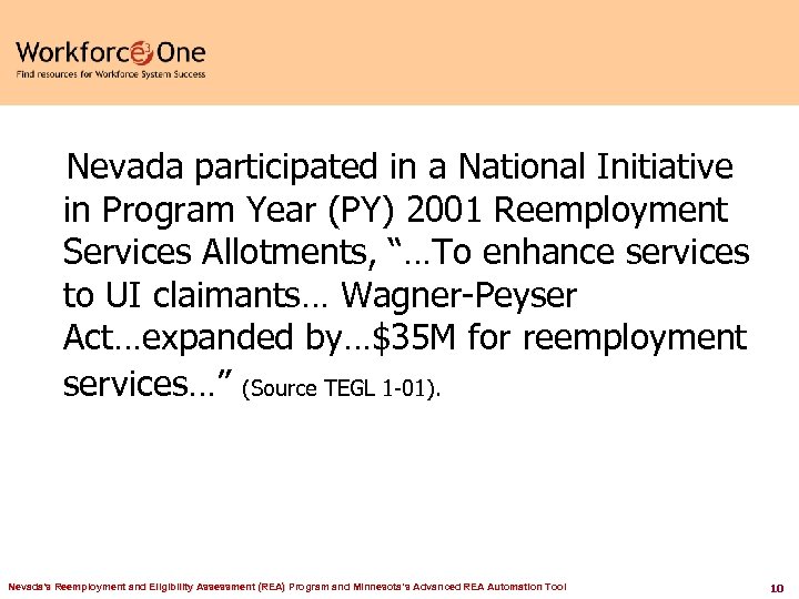 Nevada participated in a National Initiative in Program Year (PY) 2001 Reemployment Services Allotments, “…To enhance services to UI claimants… Wagner-Peyser Act…expanded by…$35 M for reemployment services…” (Source TEGL 1 -01). Nevada's Reemployment and Eligibility Assessment (REA) Program and Minnesota’s Advanced REA Automation Tool 10