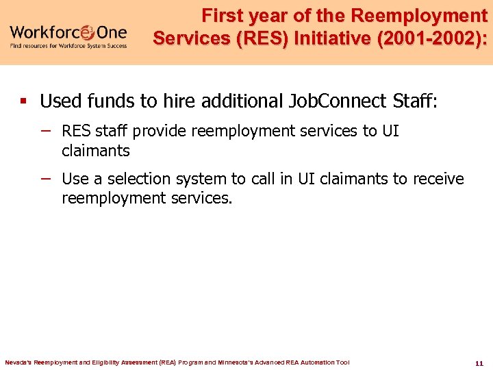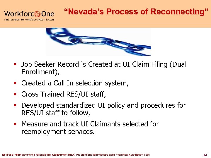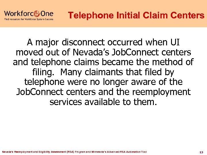 Telephone Initial Claim Centers A major disconnect occurred when UI moved out of Nevada’s Job. Connect centers and telephone claims became the method of filing. Many claimants that filed by telephone were no longer aware of the Job. Connect centers and the reemployment services available to them. Nevada's Reemployment and Eligibility Assessment (REA) Program and Minnesota’s Advanced REA Automation Tool 13