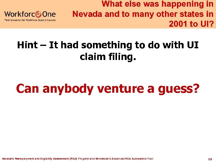 What else was happening in Nevada and to many other states in 2001 to UI? Hint – It had something to do with UI claim filing. Can anybody venture a guess? Nevada's Reemployment and Eligibility Assessment (REA) Program and Minnesota’s Advanced REA Automation Tool 12