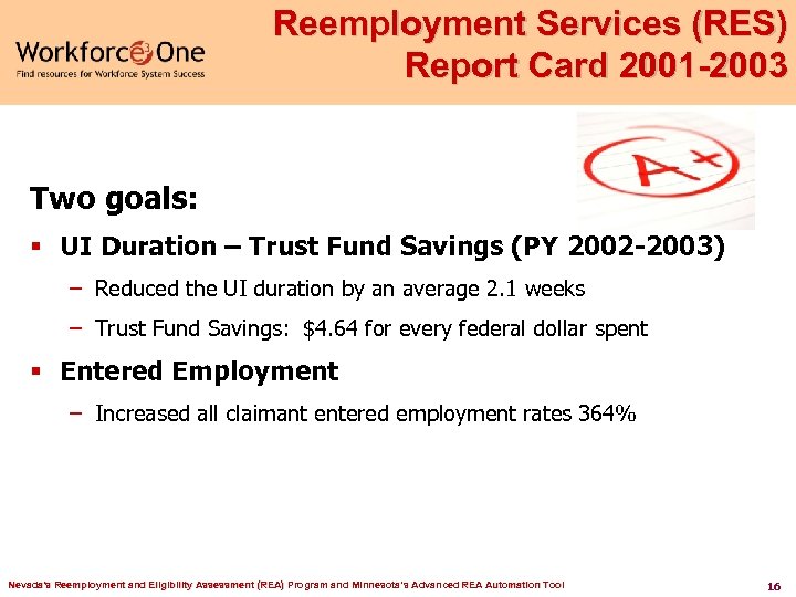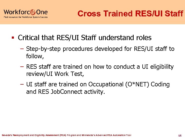 Cross Trained RES/UI Staff § Critical that RES/UI Staff understand roles – Step-by-step procedures developed for RES/UI staff to follow, – RES staff are trained on how to conduct a UI eligibility review/UI Work Test, – UI staff are trained on Occupational (O*NET) Coding and RES Job. Connect activity. Nevada's Reemployment and Eligibility Assessment (REA) Program and Minnesota’s Advanced REA Automation Tool 15