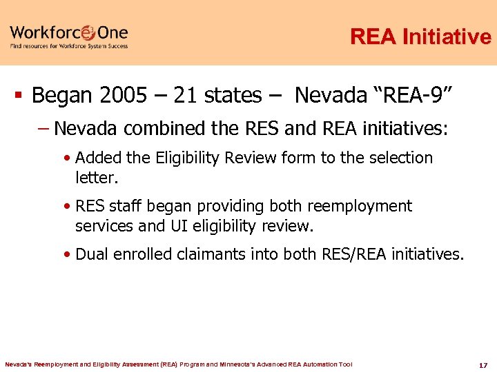 Reemployment Services (RES) Report Card 2001 -2003 Two goals: § UI Duration – Trust Fund Savings (PY 2002 -2003) – Reduced the UI duration by an average 2. 1 weeks – Trust Fund Savings: $4. 64 for every federal dollar spent § Entered Employment – Increased all claimant entered employment rates 364% Nevada's Reemployment and Eligibility Assessment (REA) Program and Minnesota’s Advanced REA Automation Tool 16