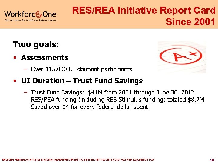 REA Initiative § Began 2005 – 21 states – Nevada “REA-9” – Nevada combined the RES and REA initiatives: • Added the Eligibility Review form to the selection letter. • RES staff began providing both reemployment services and UI eligibility review. • Dual enrolled claimants into both RES/REA initiatives. Nevada's Reemployment and Eligibility Assessment (REA) Program and Minnesota’s Advanced REA Automation Tool 17