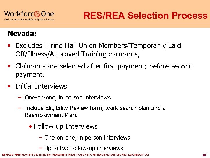 RES/REA Initiative Report Card Since 2001 Two goals: § Assessments – Over 115, 000 UI claimant participants. § UI Duration – Trust Fund Savings: $41 M from 2001 through June 30, 2012. RES/REA funding (including RES Stimulus funding) totaled $8. 7 M. Saved over $4 for every federal dollar spent. Nevada's Reemployment and Eligibility Assessment (REA) Program and Minnesota’s Advanced REA Automation Tool 18