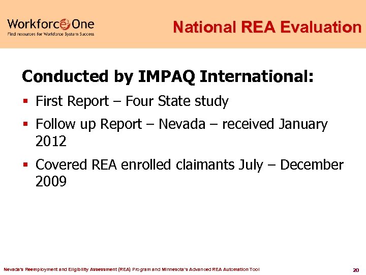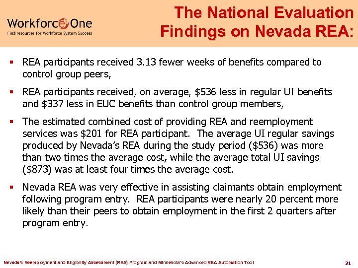 National REA Evaluation Conducted by IMPAQ International: § First Report – Four State study § Follow up Report – Nevada – received January 2012 § Covered REA enrolled claimants July – December 2009 Nevada's Reemployment and Eligibility Assessment (REA) Program and Minnesota’s Advanced REA Automation Tool 20