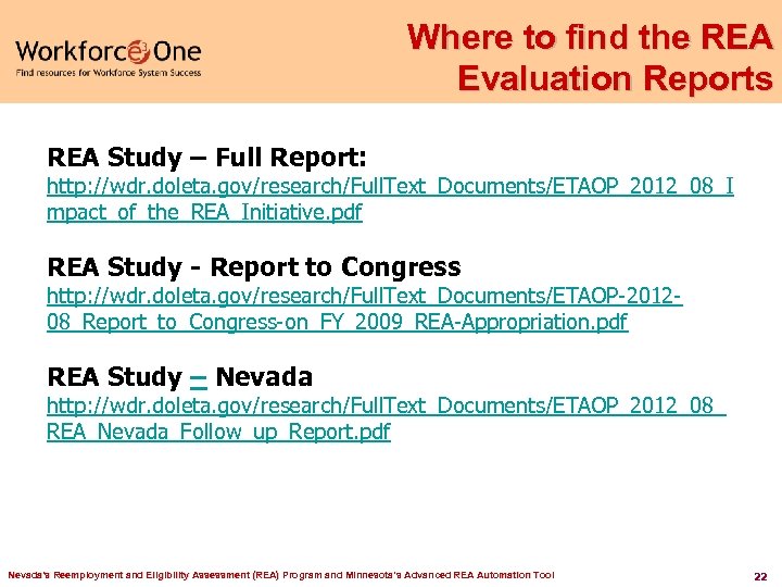 The National Evaluation Findings on Nevada REA: § REA participants received 3. 13 fewer weeks of benefits compared to control group peers, § REA participants received, on average, $536 less in regular UI benefits and $337 less in EUC benefits than control group members, § The estimated combined cost of providing REA and reemployment services was $201 for REA participant. The average UI regular savings produced by Nevada’s REA during the study period ($536) was more than two times the average cost, while the average total UI savings ($873) was at least four times the average cost. § Nevada REA was very effective in assisting claimants obtain employment following program entry. REA participants were nearly 20 percent more likely than their peers to obtain employment in the first 2 quarters after program entry. Nevada's Reemployment and Eligibility Assessment (REA) Program and Minnesota’s Advanced REA Automation Tool 21