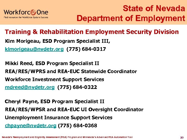 State of Nevada Department of Employment Training & Rehabilitation Employment Security Division Kim Morigeau, ESD Program Specialist III, klmorigeau@nvdetr. org (775) 684 -0317 Mikki Reed, ESD Program Specialist II REA/RES/WPRS and REA-EUC Statewide Coordinator Workforce Investment Support Services mdreed@nvdetr. org (775) 684 -0322 Cheryl Payne, ESD Program Specialist II REA/RES/WPSR and REA-EUC UI Oversight Coordinator Unemployment Insurance Support Services chpayne@nvdetr. org (775) 684 -0368 Nevada's Reemployment and Eligibility Assessment (REA) Program and Minnesota’s Advanced REA Automation Tool 23