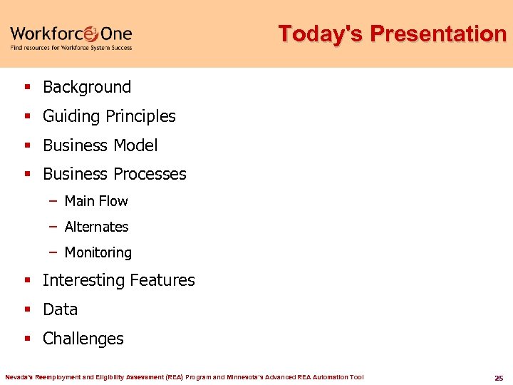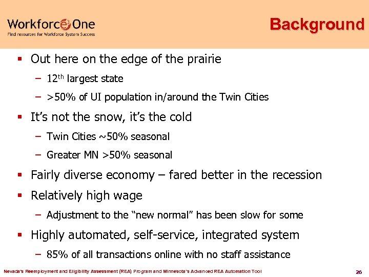 Today's Presentation § Background § Guiding Principles § Business Model § Business Processes – Main Flow – Alternates – Monitoring § Interesting Features § Data § Challenges Nevada's Reemployment and Eligibility Assessment (REA) Program and Minnesota’s Advanced REA Automation Tool 25