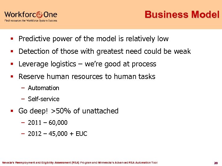 Guiding Principles § Character doesn’t change when you become unemployed: – Most want a job now – Many don’t know what to do – scared and depressed – We may “punish” inaction, but we don’t “punish” ignorance § Constantly changing labor market = challenges for matching workers to jobs § Focus on creating an action plan – do something! § You’re not alone – one stops and community resources § Applicants are smart § Transfer ownership, hold accountable Nevada's Reemployment and Eligibility Assessment (REA) Program and Minnesota’s Advanced REA Automation Tool 27