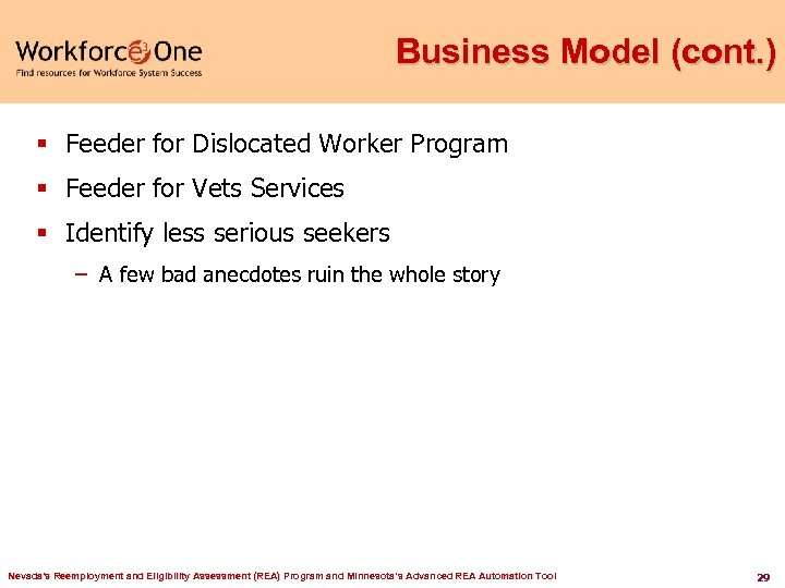 Business Model (cont. ) § Feeder for Dislocated Worker Program § Feeder for Vets Services § Identify less serious seekers – A few bad anecdotes ruin the whole story Nevada's Reemployment and Eligibility Assessment (REA) Program and Minnesota’s Advanced REA Automation Tool 29
