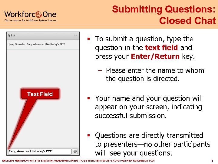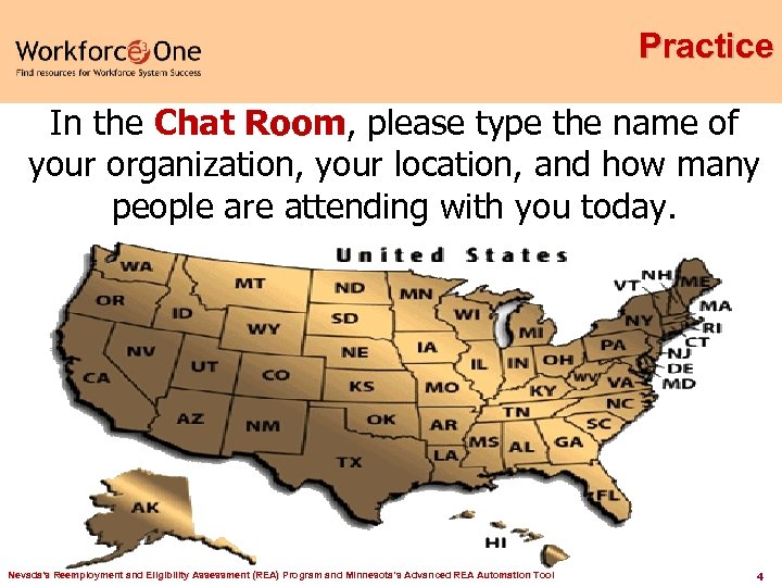 Practice In the Chat Room, please type the name of your organization, your location, and how many people are attending with you today. Nevada's Reemployment and Eligibility Assessment (REA) Program and Minnesota’s Advanced REA Automation Tool 4