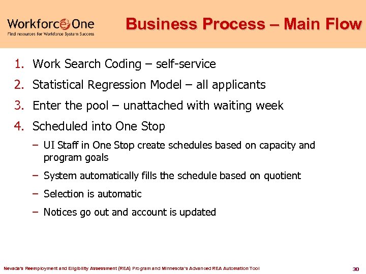 Business Process – Main Flow 1. Work Search Coding – self-service 2. Statistical Regression Model – all applicants 3. Enter the pool – unattached with waiting week 4. Scheduled into One Stop – UI Staff in One Stop create schedules based on capacity and program goals – System automatically fills the schedule based on quotient – Selection is automatic – Notices go out and account is updated Nevada's Reemployment and Eligibility Assessment (REA) Program and Minnesota’s Advanced REA Automation Tool 30