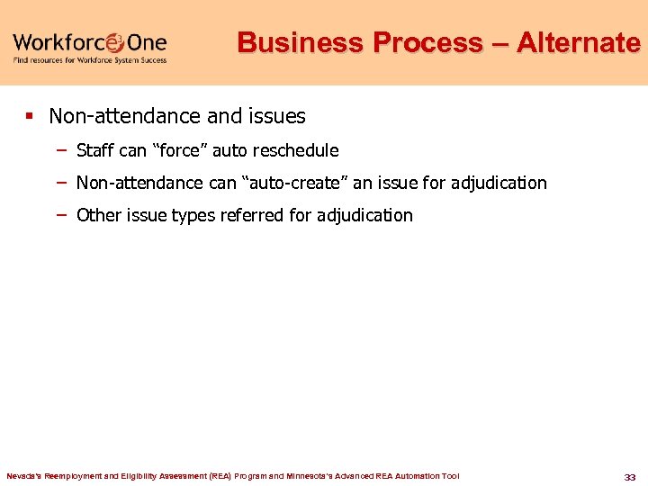 Business Process – Alternate § IVR Users – Limited version of assessment available in IVR – Staff adds items to assessment and plan at orientation § Non-traditional participants (EUC, mass layoff) – Can be scheduled in their own groups – Same process as regular participants § Assessment and plan is available to all applicants § Capacity to assign assessment and plan to individual applicants ad hoc – Other issue types referred for adjudication Nevada's Reemployment and Eligibility Assessment (REA) Program and Minnesota’s Advanced REA Automation Tool 32