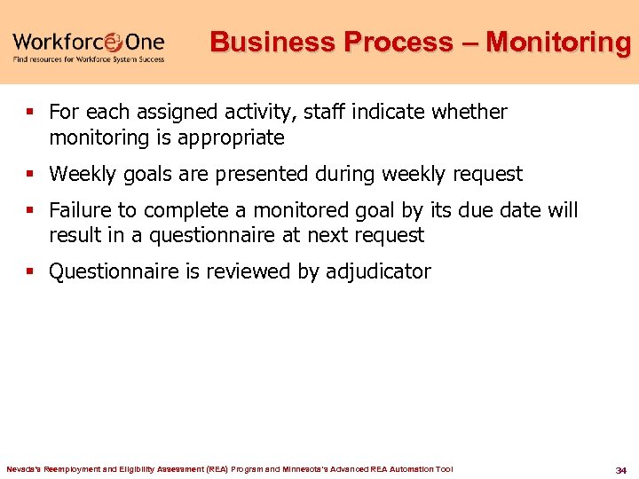 Business Process – Alternate § Non-attendance and issues – Staff can “force” auto reschedule – Non-attendance can “auto-create” an issue for adjudication – Other issue types referred for adjudication Nevada's Reemployment and Eligibility Assessment (REA) Program and Minnesota’s Advanced REA Automation Tool 33
