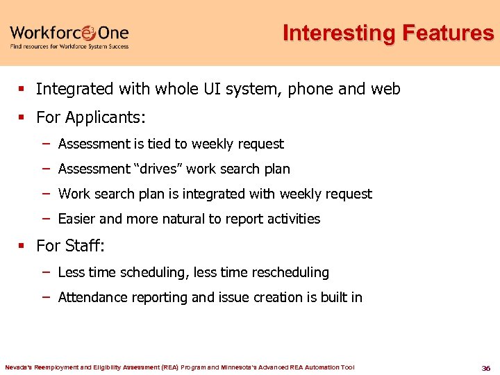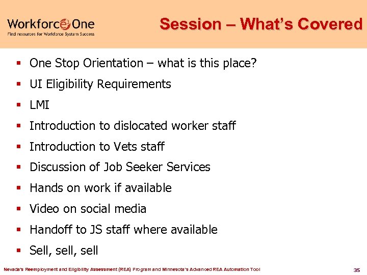 Session – What’s Covered § One Stop Orientation – what is this place? § UI Eligibility Requirements § LMI § Introduction to dislocated worker staff § Introduction to Vets staff § Discussion of Job Seeker Services § Hands on work if available § Video on social media § Handoff to JS staff where available § Sell, sell Nevada's Reemployment and Eligibility Assessment (REA) Program and Minnesota’s Advanced REA Automation Tool 35