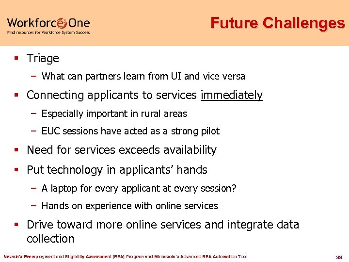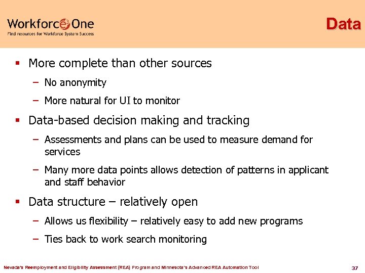 Data § More complete than other sources – No anonymity – More natural for UI to monitor § Data-based decision making and tracking – Assessments and plans can be used to measure demand for services – Many more data points allows detection of patterns in applicant and staff behavior § Data structure – relatively open – Allows us flexibility – relatively easy to add new programs – Ties back to work search monitoring Nevada's Reemployment and Eligibility Assessment (REA) Program and Minnesota’s Advanced REA Automation Tool 37