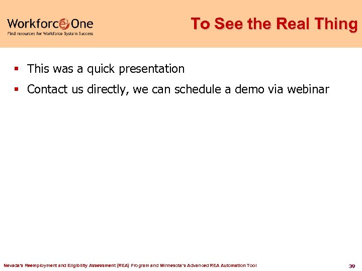 To See the Real Thing § This was a quick presentation § Contact us directly, we can schedule a demo via webinar Nevada's Reemployment and Eligibility Assessment (REA) Program and Minnesota’s Advanced REA Automation Tool 39