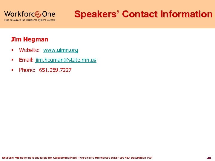 Speakers’ Contact Information Jim Hegman § Website: www. uimn. org § Email: jim. hegman@state. mn. us § Phone: 651. 259. 7227 Nevada's Reemployment and Eligibility Assessment (REA) Program and Minnesota’s Advanced REA Automation Tool 40