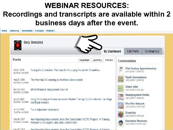 WEBINAR RESOURCES: Resources Access to Webinar Recordings and transcripts are available within 2 business days after the event. Nevada's Reemployment and Eligibility Assessment (REA) Program and Minnesota’s Advanced REA Automation Tool 5