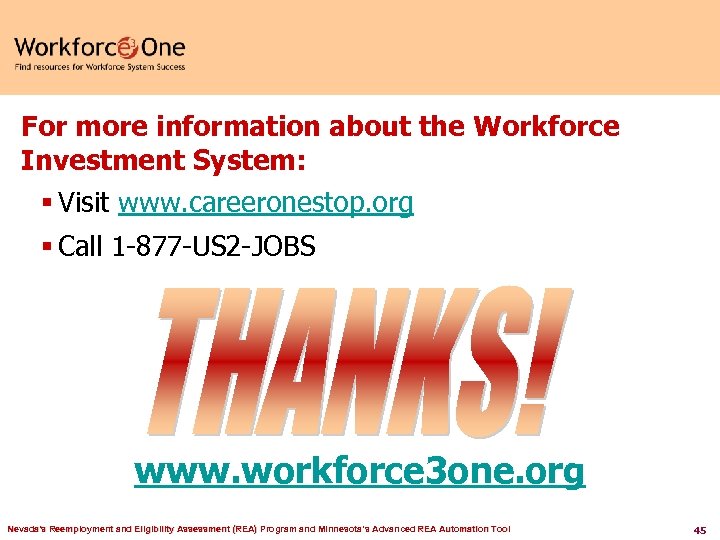 For more information about the Workforce Investment System: § Visit www. careeronestop. org § Call 1 -877 -US 2 -JOBS www. workforce 3 one. org Nevada's Reemployment and Eligibility Assessment (REA) Program and Minnesota’s Advanced REA Automation Tool 45