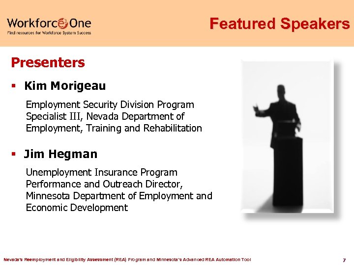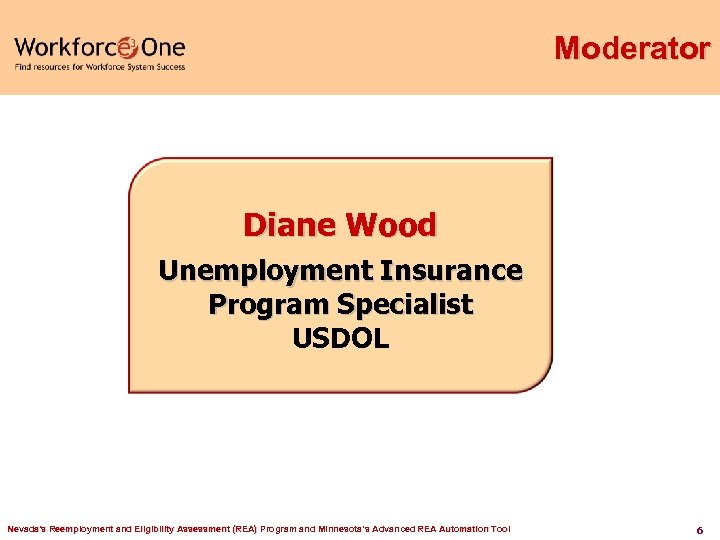 Moderator Diane Wood Unemployment Insurance Program Specialist USDOL Nevada's Reemployment and Eligibility Assessment (REA) Program and Minnesota’s Advanced REA Automation Tool 6