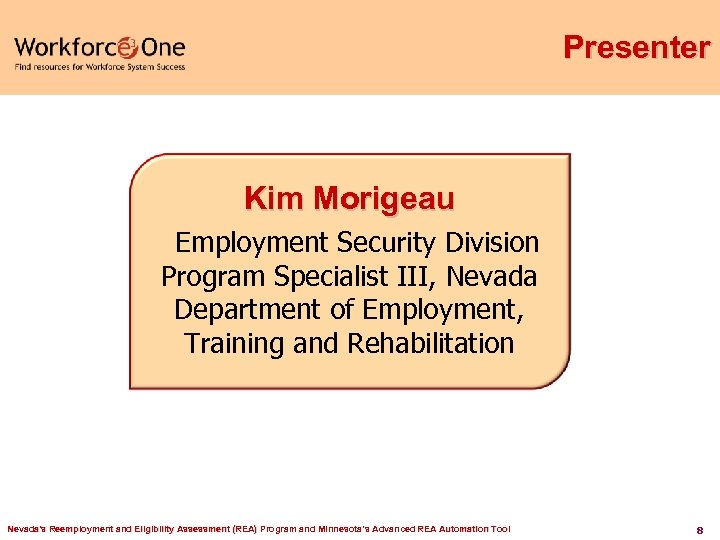 Featured Speakers Presenters § Kim Morigeau Employment Security Division Program Specialist III, Nevada Department of Employment, Training and Rehabilitation § Jim Hegman Unemployment Insurance Program Performance and Outreach Director, Minnesota Department of Employment and Economic Development Nevada's Reemployment and Eligibility Assessment (REA) Program and Minnesota’s Advanced REA Automation Tool 7