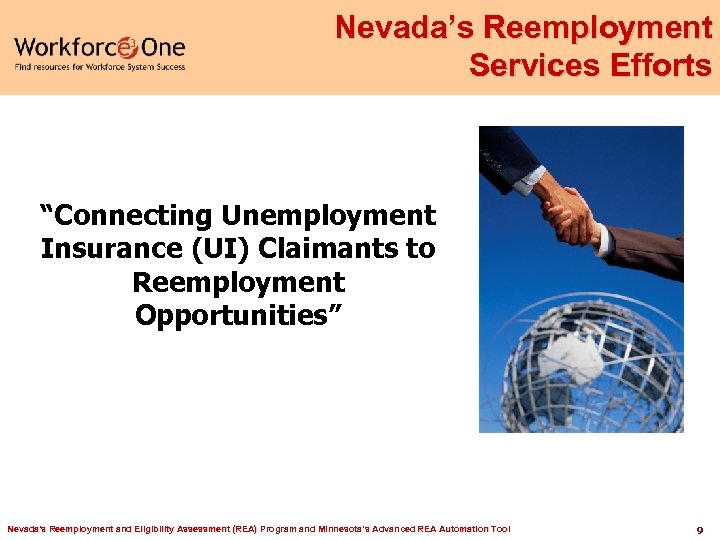 Presenter Kim Morigeau Employment Security Division Program Specialist III, Nevada Department of Employment, Training and Rehabilitation Nevada's Reemployment and Eligibility Assessment (REA) Program and Minnesota’s Advanced REA Automation Tool 8