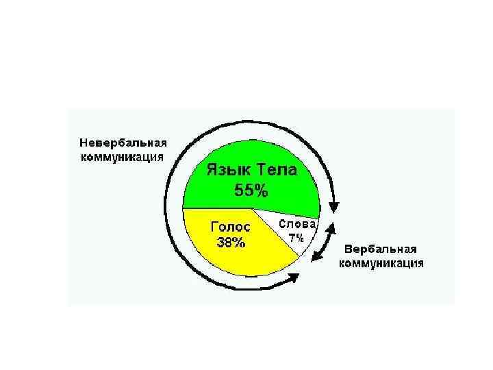 Психолог Альберт Мейерабиан установил, что передача информации происходит: за счет вербальных средств (только слов) на 7%; за счет звуковых средств (включая тон голоса, интонацию звука) на 38%; за счет невербальных средств на 55%