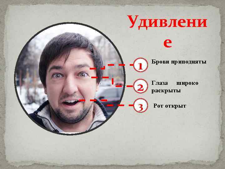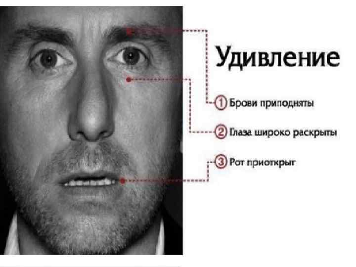 Удивлени е 1 Брови приподняты 2 Глаза широко раскрыты 3 Рот открыт