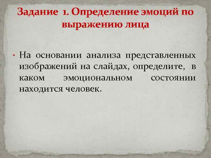 Задание 1. Определение эмоций по выражению лица • На основании анализа представленных изображений на слайдах, определите, в каком эмоциональном состоянии находится человек.