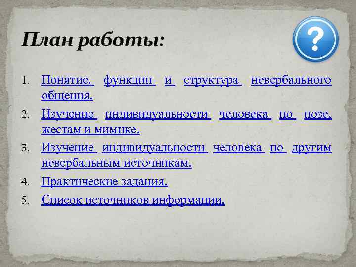 План работы: 1. 2. 3. 4. 5. Понятие, функции и структура невербального общения. Изучение индивидуальности человека по позе, жестам и мимике. Изучение индивидуальности человека по другим невербальным источникам. Практические задания. Список источников информации.