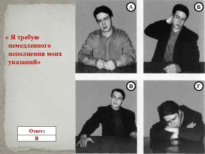 А Б В Г « Я требую немедленного исполнения моих указаний» Ответ: В
