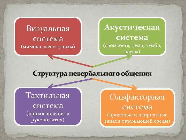Визуальная система (мимика, жесты, позы) Акустическая система (громкость, темп, тембр, паузы) Структура невербального общения Тактильная система (прикосновения и рукопожатия) Ольфакторная система (приятные и неприятные запахи окружающей среды)