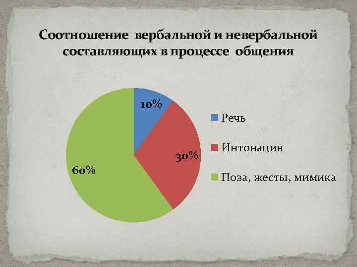 Соотношение вербальной и невербальной составляющих в процессе общения 10% Речь 30% 60% Интонация Поза, жесты, мимика