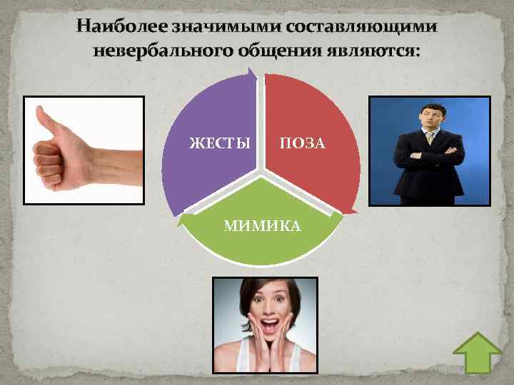 Наиболее значимыми составляющими невербального общения являются: ЖЕСТЫ ПОЗА МИМИКА