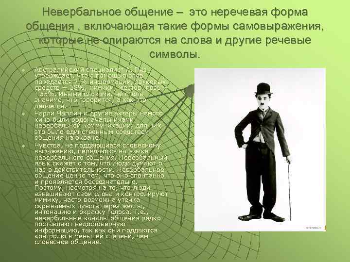 Невербальное общение – это неречевая форма общения , включающая такие формы самовыражения, которые не опираются на слова и другие речевые символы. u u u Австралийский специалист А. Пиз утверждает, что с помощью слов передается 7 % информации, звуковых средств -- 38%, мимики, жестов, позы - 55%. Иными словами, не столь значимо, что говорится, а как это делается. Чарли Чаплин и другие актеры немого кино были родоначальниками невербальной коммуникации, для них это было единственным средством общения на экране. Чувства, не поддающиеся словесному выражению, передаются на языке невербального общения. Невербальный язык скажет о том, что люди думают о нас в действительности. Невербальное общение ценно тем, что оно спонтанно и проявляется бессознательно. Поэтому, несмотря на то, что люди взвешивают свои слова и контролируют мимику, часто возможна утечка скрываемых чувств через жесты, интонацию и окраску голоса. Т. е. , невербальные каналы общения редко поставляют недостоверную информацию, так как они поддаются контролю в меньшей степени, чем словесное общение.