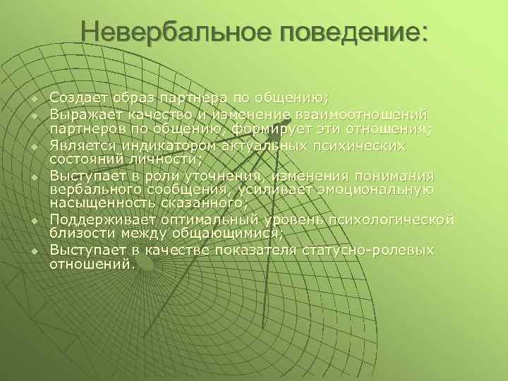 Невербальное поведение: u u u Создает образ партнера по общению; Выражает качество и изменение взаимоотношений партнеров по общению, формирует эти отношения; Является индикатором актуальных психических состояний личности; Выступает в роли уточнения, изменения понимания вербального сообщения, усиливает эмоциональную насыщенность сказанного; Поддерживает оптимальный уровень психологической близости между общающимися; Выступает в качестве показателя статусно-ролевых отношений.