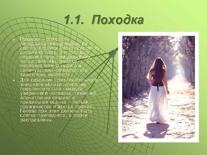 1. 1. Походка u u Походка – это стиль передвижения человека. Ее составляющими являются: ритм, динамика шага, амплитуда переноса тела при движении, масса тела. По походке человека можно судить о самочувствии человека, его характере, возрасте. Для создания привлекательного внешнего облика наиболее предпочтительна походка уверенного человека, такое же впечатление создает и правильная осанка – легкая, пружинистая и всегда прямая. Голова при этом должна быть слегка приподнята, а плечи расправлены.