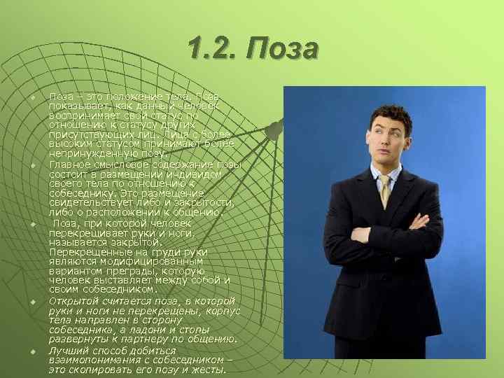1. 2. Поза u u u Поза – это положение тела. Поза показывает, как данный человек воспринимает свой статус по отношению к статусу других присутствующих лиц. Лица с более высоким статусом принимают более непринужденную позу. Главное смысловое содержание позы состоит в размещении индивидом своего тела по отношению к собеседнику. Это размещение свидетельствует либо и закрытости, либо о расположении к общению. Поза, при которой человек перекрещивает руки и ноги, называется закрытой. Перекрещенные на груди руки являются модифицированным вариантом преграды, которую человек выставляет между собой и своим собеседником. Открытой считается поза, в которой руки и ноги не перекрещены, корпус тела направлен в сторону собеседника, а ладони и стопы развернуты к партнеру по общению. Лучший способ добиться взаимопонимания с собеседником – это скопировать его позу и жесты.