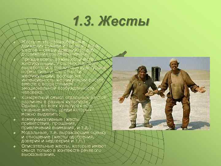 1. 3. Жесты u u u Жесты – это разнообразные движения руками и головой. Язык жестов – самый древний способ достижения взаимопонимания. Прежде всего, важно количество жестикуляции. У разных народов выработались различные культурные нормы силы и частотности жестикуляции. Вообще же интенсивность жестикуляции растет вместе с возрастанием эмоциональной возбужденности человека. Конкретный смысл отдельных жестов различен в разных культурах. Однако, во всех культурах есть сходные жесты, среди которых можно выделить: Коммуникативные (жесты приветствия, прощания, привлечения внимания, и т. д. ) Модальные, т. е. выражающие оценку и отношение (жесты одобрения, доверия и недоверия и т. п. ) Описательные жесты, которые имеют смысл только в контексте речевого высказывания.