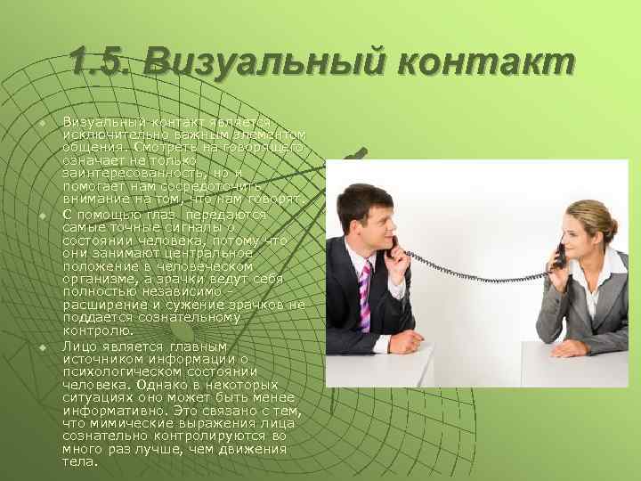 1. 5. Визуальный контакт u u u Визуальный контакт является исключительно важным элементом общения. Смотреть на говорящего означает не только заинтересованность, но и помогает нам сосредоточить внимание на том, что нам говорят. С помощью глаз передаются самые точные сигналы о состоянии человека, потому что они занимают центральное положение в человеческом организме, а зрачки ведут себя полностью независимо расширение и сужение зрачков не поддается сознательному контролю. Лицо является главным источником информации о психологическом состоянии человека. Однако в некоторых ситуациях оно может быть менее информативно. Это связано с тем, что мимические выражения лица сознательно контролируются во много раз лучше, чем движения тела.