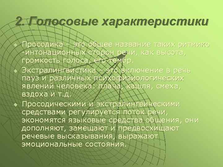2. Голосовые характеристики u u u Просодика – это общее название таких ритмико -интонационных сторон речи, как высота, громкость голоса, его тембр. Экстралингвистика – это включение в речь пауз и различных психофизиологических явлений человека: плача, кашля, смеха, вздоха и т. д. Просодическими и экстралингвическими средствами регулируется поток речи, экономятся языковые средства общения, они дополняют, замещают и предвосхищают речевые высказывания, выражают эмоциональные состояния.
