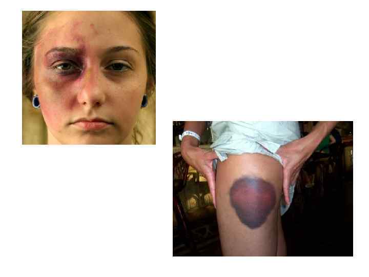 Гематома - кров'яна пухлина, яка утворюється внаслідок скупчення крові в тканинах або порожнинах. • Клініка гематоми: • Обмежена болюча припухлість, відчуття напруженості і розпирання. Гематоми на обличчі часом досягають великих розмірів (захоплюють повіки і переходять із обличчя на під'язикову ділянку, шию, надпліччя, груди, спину). При поверхневому розміщенні пухлини видні синці, набряк.