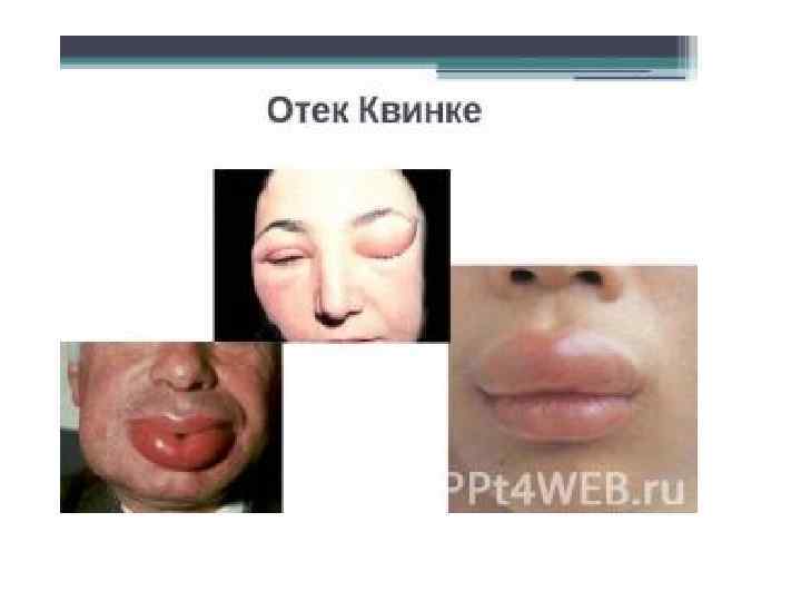 Симптоми. • характеризується гострим серозним набряком слизових оболонок порожнини рота, верхніх дихальних шляхів, найчастіше м'яких тканин обличчя (губ, повік, периорбитальной клітковини). Набряк щільний, обмежений, при натисканні заглиблень не залишає. • Спостерігаються нудота, блювання, діарея, порушується загальний стан.